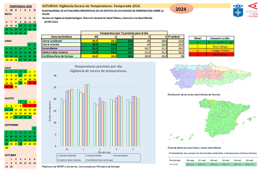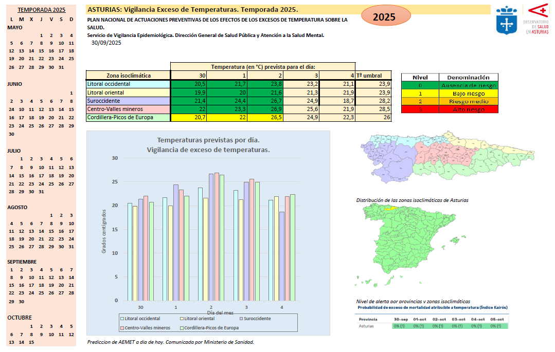 Durante este periodo se mantendrá un monitorización de las previsiones de temperaturas para Asturias elaboradas por la AEMET, y se difundirán Alertas relacionadas con el calor en caso de que estas previsiones superen los niveles considerados de riesgo para la salud, diferenciado entre situaciones de riesgo bajo, medio y alto. Folleto Cuida tu salud. Protégete del calor