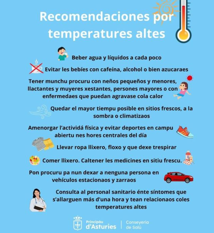 El 16 de mayo de 2025, la Dirección General de Salud Pública y Atención a la Salud Mental pone en marcha, de nuevo, el Plan de Prevención de los Efectos Sanitarios de las Altas Temperaturas, en coordinación con el Ministerio de Sanidad, Servicios Sociales e Igualdad. Este Plan, que se activa todos los veranos durante los meses de mayo a septiembre, se puso en marcha por primera vez en 2004, como respuesta ante situaciones como la ola de calor sufrida en el año 2003. Durante estos días, la Dirección General de Salud Pública y Atención a la Salud Mental pone a disposición de los interesados el folleto «Cuida tu salud. Protégete del sol», en la web de ASTURSALUD con recomendaciones sanitarias ante situaciones de altas temperaturas, dirigida especialmente a centros sanitarios y sociales, así como a reside
