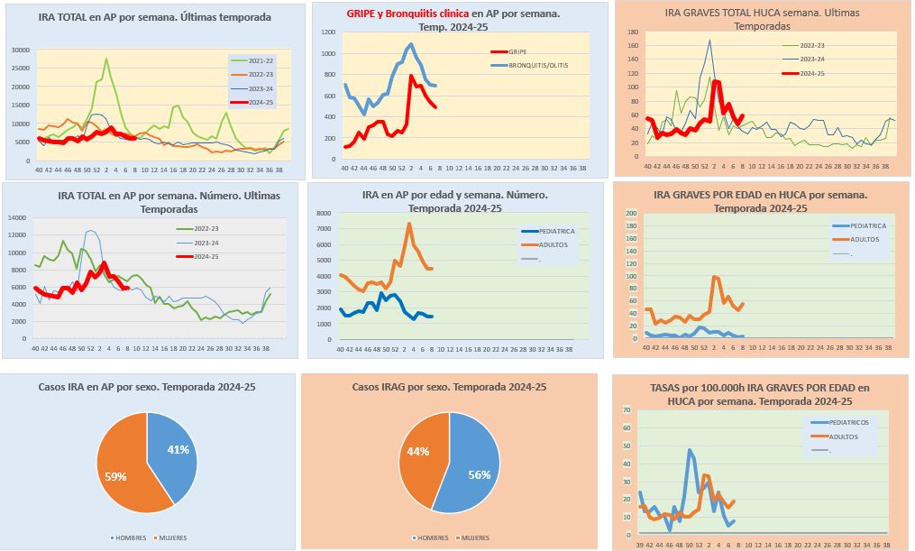 La evolucion de las IRA en AP es estable en esta semana, en todas edades. EN IRA graves en hospital han aumentado un 22% en todas edades. No obstante por cuadros clínicos bajan tanto en AP la gripe como ls bronquitis y bronquiolitis. Por agente biológico, bajan un 17% las detecciones de virus gripal (especialmente IA), también un 20% VRS y COVID19 se mantiene estable con mínima incidencia. Parece que en esta temporada ya están controladas las ondas epidémicas de circulación viral: COVID19 no hubo ninguna, VRS tuvo acmé hace bastantes semanas y gripe los tuvo en la última semana de enero 2025. Solo queda el paulatino declinar de dichas ondas hasta llegar a la nula circulación. . |